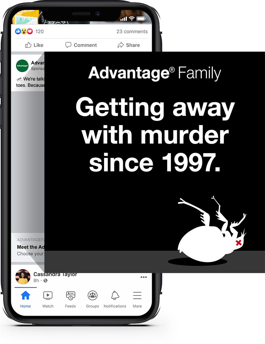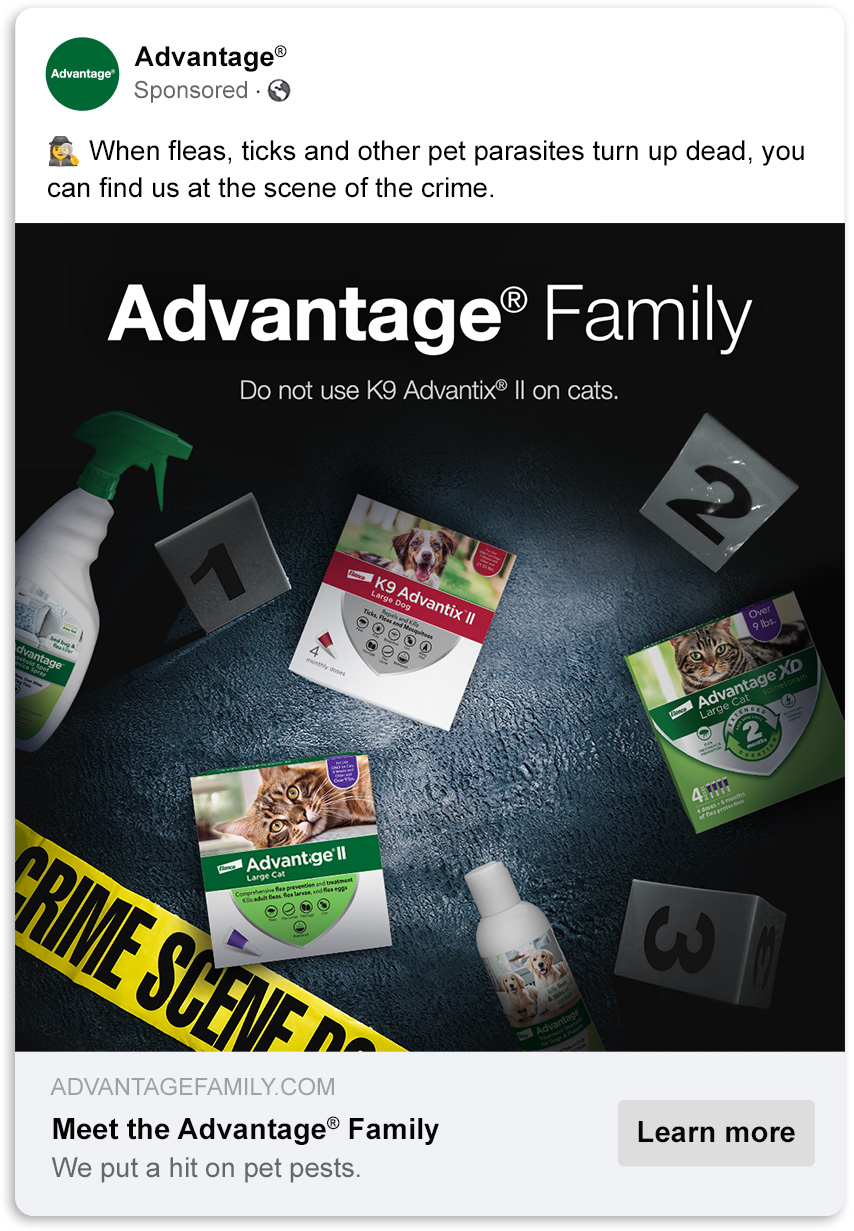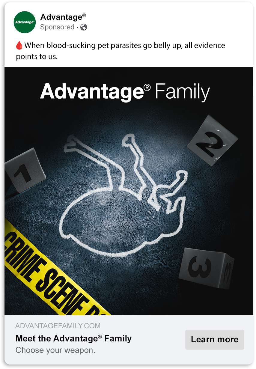Bold headlines and punchy reveals arrest consumer attention. I created dramatic imagery themed around flea death and organized crime to expand the Advantage Family’s story while creating intrigue.