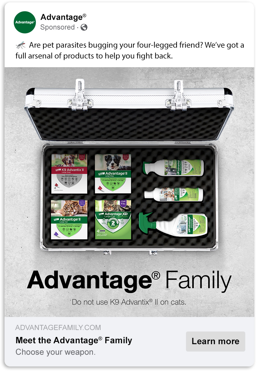 Elanco’s “Welcome to the Family” campaign introduces pet owner to a family of parasite prevention products that embraces what pet protection is really about: murder (flea murder, that is). The campaign leverages dramatic visuals and dark humor to break through the cuddly white noise of pet protection advertising while positioning the Advantage Family as a powerful ally any pet parent would be glad to have on their side.