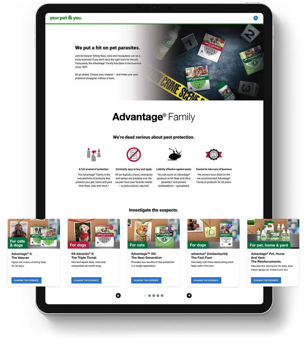 The landing page picks up where ads leave off, expounding on the Family’s benefits. Family member introduction cards guide pet owners seamlessly down the purchasing funnel by incorporating individual brand assets and benefits within the context of a police investigation board.