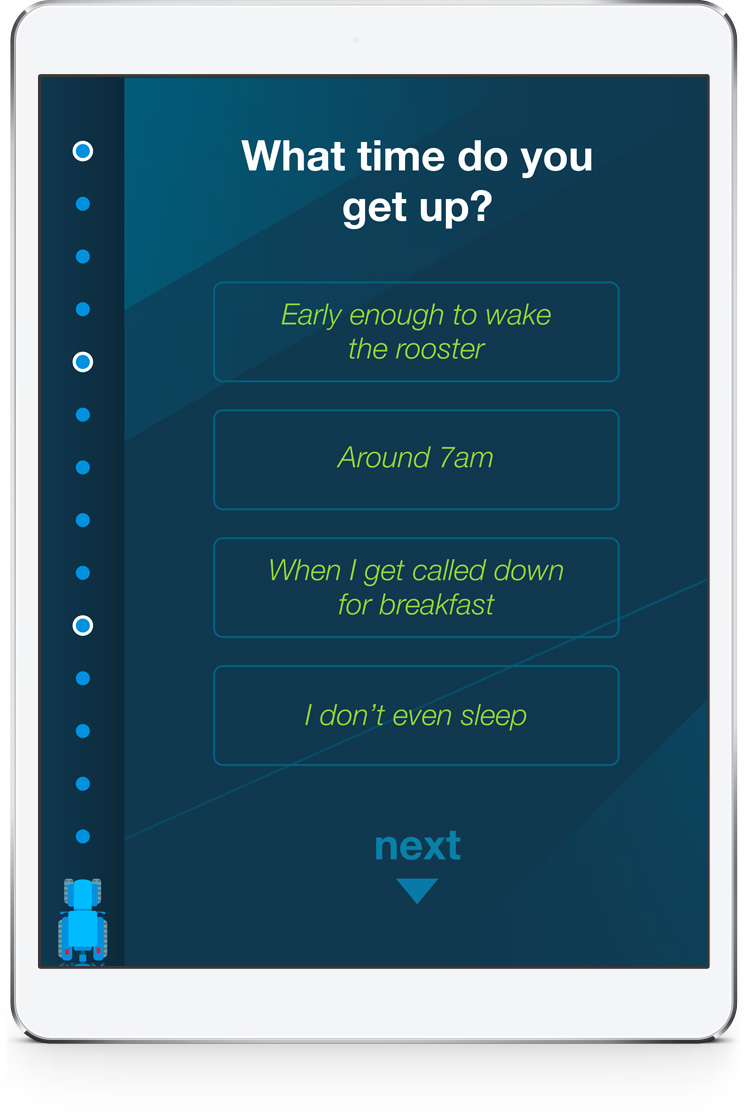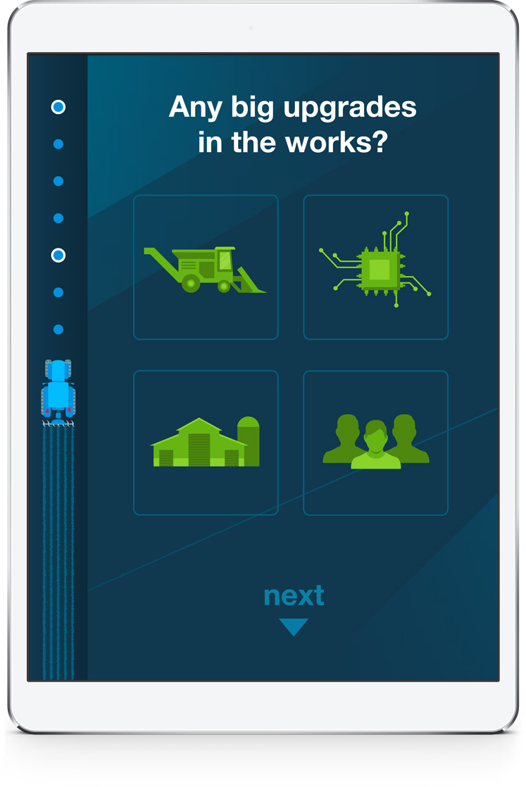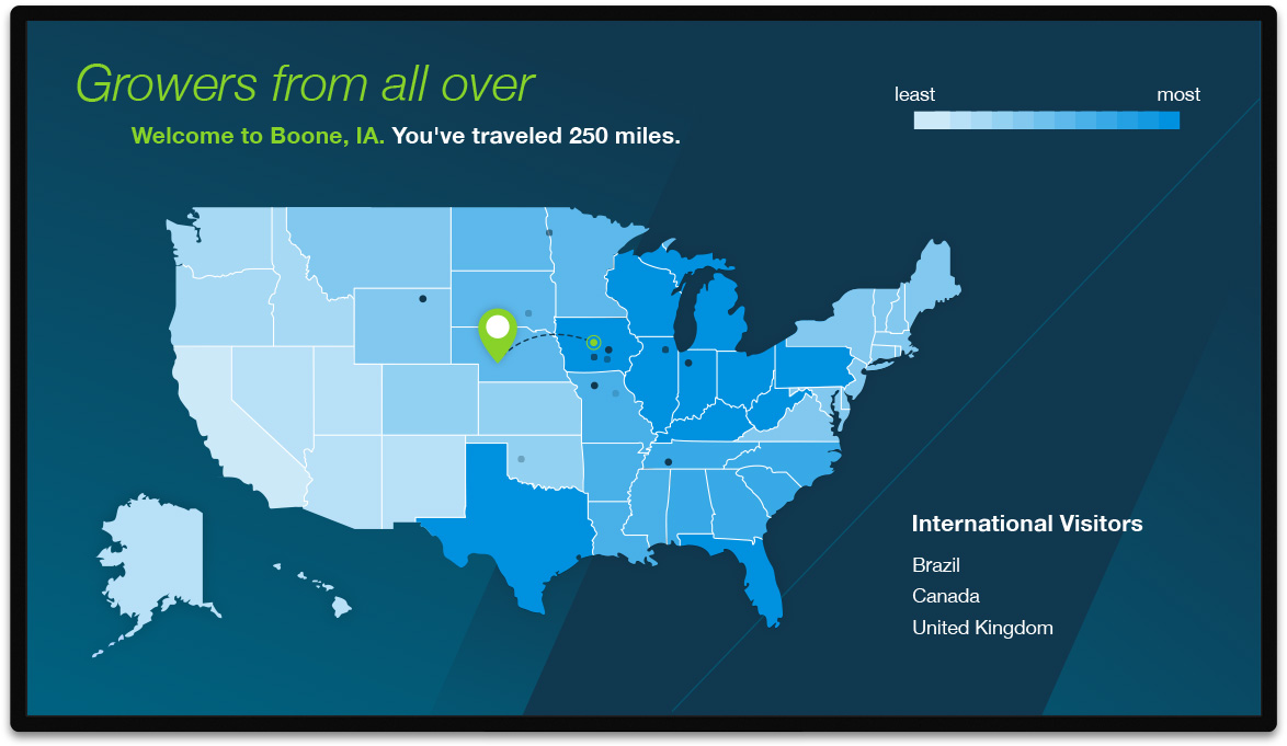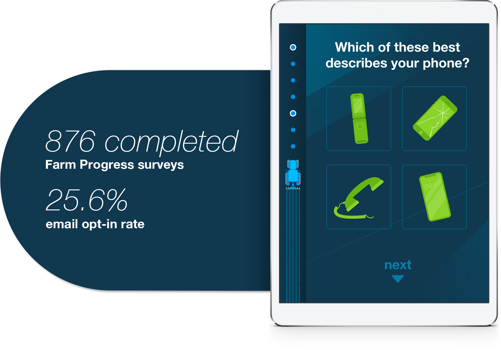 Inside the tent, growers are invited to complete a short survey on iPads in exchange for Bayer Crop Science swag. The survey questions are humorous and easy to answer, with branching logic and follow-up questions designed to uncover grower insights. After key questions, the survey reveals how the grower’s answer stacks up to other respondees, incentivizing progression and increasing the survey’s entertainment value. A large screen behind the iPad survey bay attracts attention from a distance. It displays aggregate results in real time, adding to the fun and allowing attendees to compare themselves to growers from across the country.