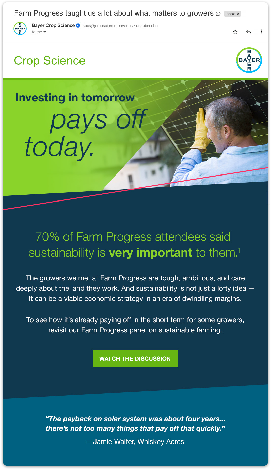 We leveraged insights gained from the survey to deliver more valuable content to growers. A Farm Progress follow up email demonstrated Bayer Crop Science’s promise to use provided data to better connect with and serve growers.