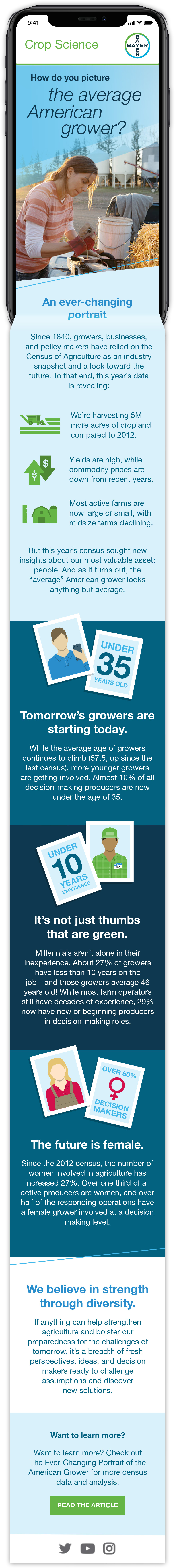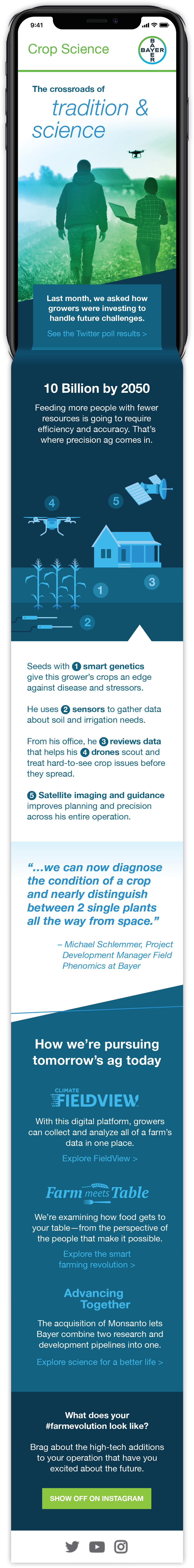 The cyclical nature of agricultural operations combined with US growers’ practical mindset presents a challenge to Bayer Crop Science: They need to remain top-of-mind and add value to a grower’s operation — even when there is nothing to sell. The total market email program was developed to keep growers engaged year-round. It leverages BCS’s resources and expertise to position the company as a partner to growers navigating a complex and quickly evolving industry. Total market emails cover the future of farming, community, and industry thought leadership in an approachable manner, inviting growers to engage with social media and the greater agricultural community. In turn, insights gleaned from grower social media interactions help inform future email content.