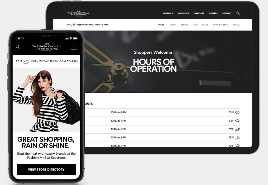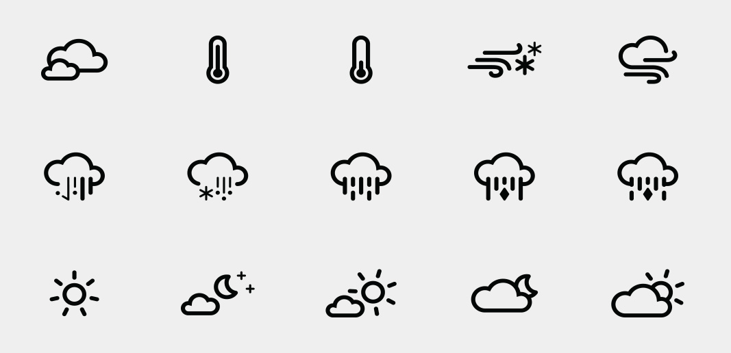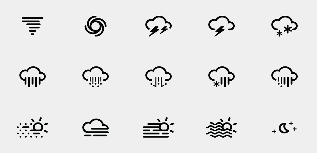 Weather icon set designed for display on Simon Property Group’s mall pages. The icons represent over 30 different forecasts, ranging from freezing rain to dust storms, while remaining highly legible at a small scale.