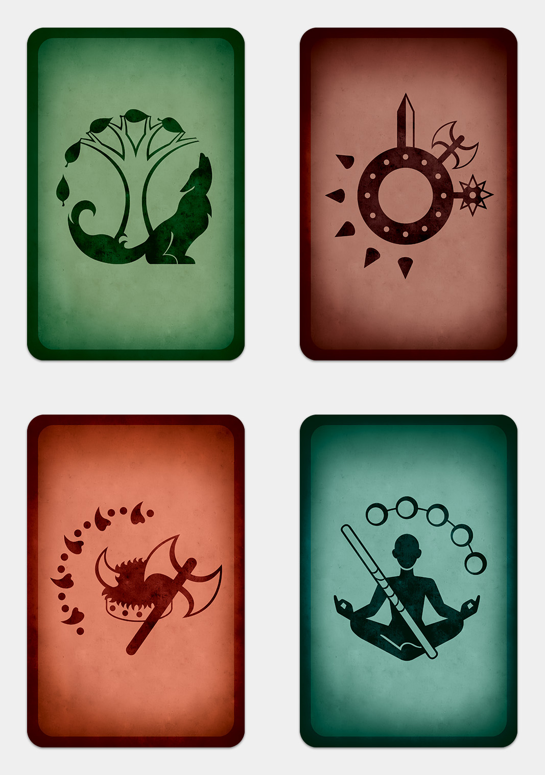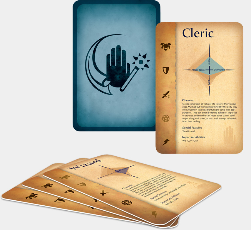 The character class cards were developed to lower barriers to new players by transforming Dungeons and Dragons 3.5’s intimidating class selection process into a set of approachable, easy-to-compare options. The illustrations on the back of each card provide a visual summary of the base character classes. Later, the class illustrations have been distilled into icons for use on supplementary cards.